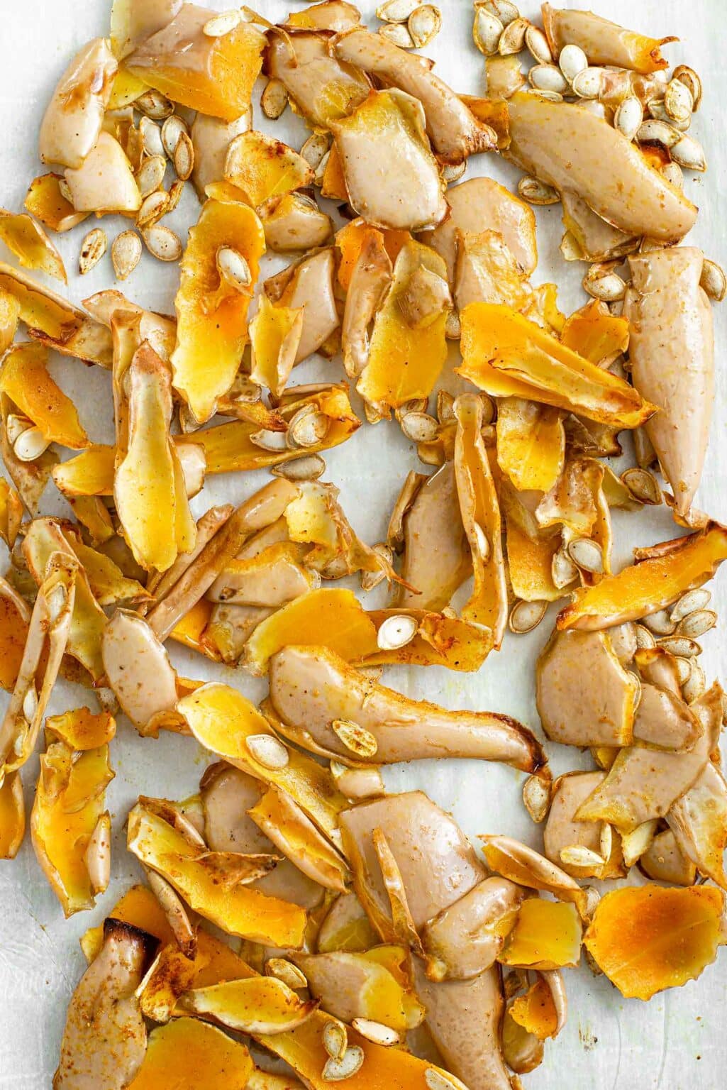 - Don’t toss the seeds or the skin of your Butternut beauty – wash the skin well before peeling it, prep your skins and seeds on a tray, get creative with the seasonings. Roast them up together and use them as a snack or a garnish. Enjoy, learn more and watch the video here.