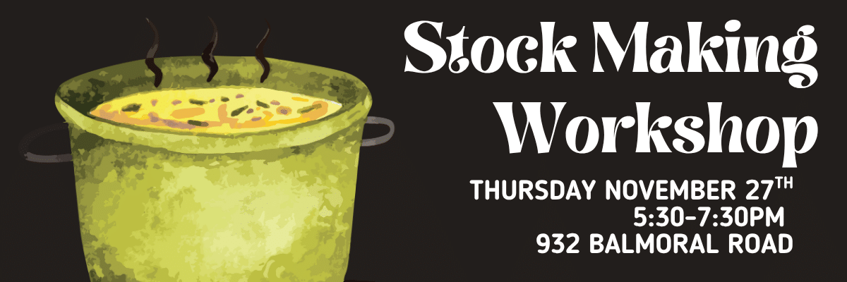 Join us for a cozy kitchen workshop, we will be exploring ways to reduce food waste, turning kitchen scraps into delicous and nutritious stock! A perfect base for soups and stews and a perfect addition to so many dishes. All supplies will be provided and participants will get to take home a jar of stock.