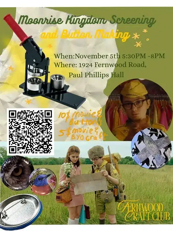 What kind of bird are you?? Find out this November 5th while screening Wes Anderson’s Moonrise Kingdom from 5:30pm to 8:00PM at 1924 Fernwood Road and make your very own pin back buttons while watching! All craft materials provided (collage supplies, paper, scissors, glue, button making supplies, glitter etc). Bring a pal and enjoy an evening of crafting while enjoying the whimsy of Wes Anderson! Tickets are 10 dollars all craft materials included, or BYO craft and enjoy the movie for 5$. Tickets available online or with cash at the door!