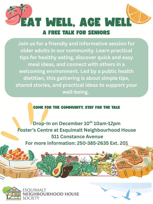 Join us December 10th at 10am for a Free Talk for Seniors – Eat Well, Age Well. Led by a public health dietitian, learn practical tips for healthy eating at Esquimalt Neighbourhood House, 511 Constance Ave.