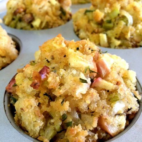 Sourdough Stuffing Muffins with Apple and Fresh Herbs are the perfect way to use up those wrinkly apples, limp herbs and celery or that bread that needs to get used up. The muffin trays make perfect portion sizes and make it easy to freeze for later meals. This is a great way to use some extra veg.
