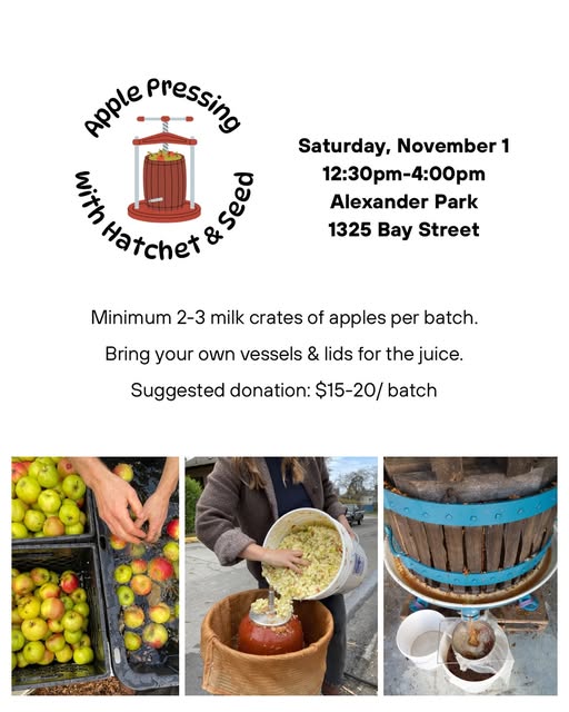 November 1 @hatchetnseed will be joining us at Alexander Park to press your apples!