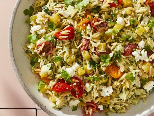 Who says a Tomato Orzo Salad with Tahini Dressing is only for summer. It’s a perfect side or lunch. The caramelized vegetables add a rich, warm flavour to this now fall salad!