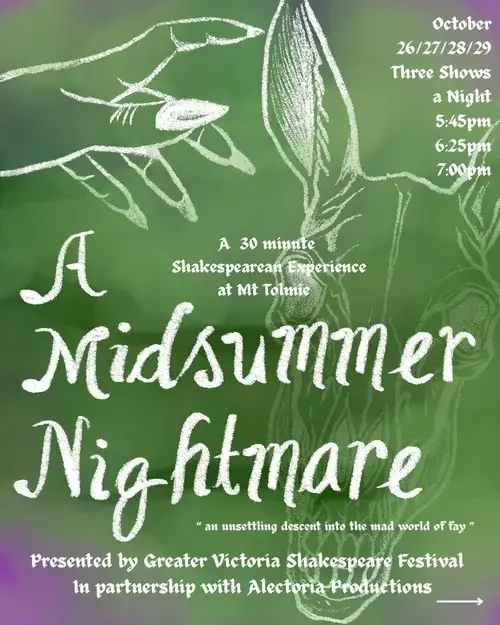 Experience Shakespeare like never before in this 30-minute outdoor horror walk through Mount Tolmie’s darkened paths, where familiar fairy tales twist into nightmares and the fay realm threatens to trap you forever.